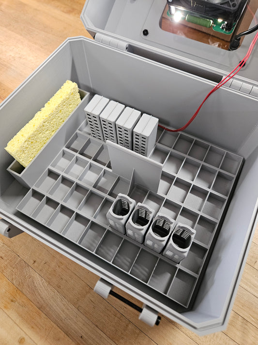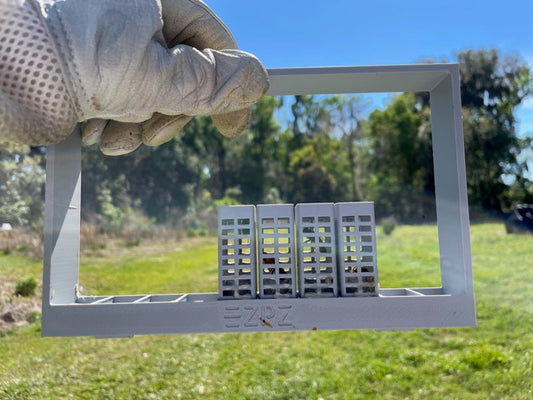 Raising queens is full of challenges. Let EZPZ help you protect your valuable investment by keeping your queens safe from threats. Whether you use JZBZ, Nicot or even your own wax cell cups for raising queens, this cage is for you! Keep your cells from being torn down or killed by a rogue queen. Keep your newly emerged virgins from fighting each other. Organize your cages in the incubator and store more with compact, efficient trays. Start here for raising your own queens or take your queen breeding to the next level with EZPZ!