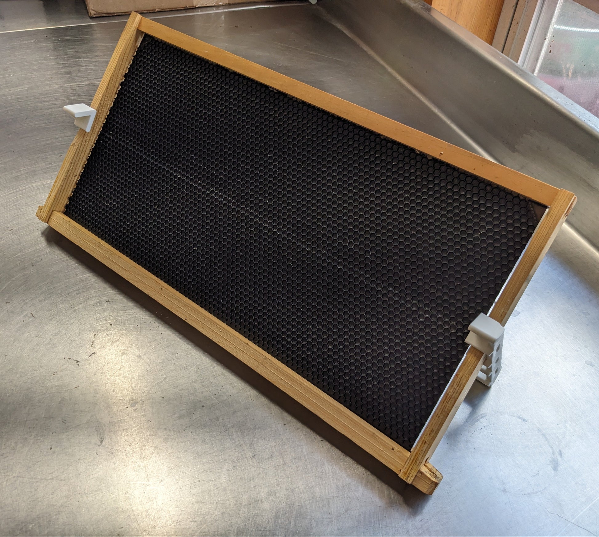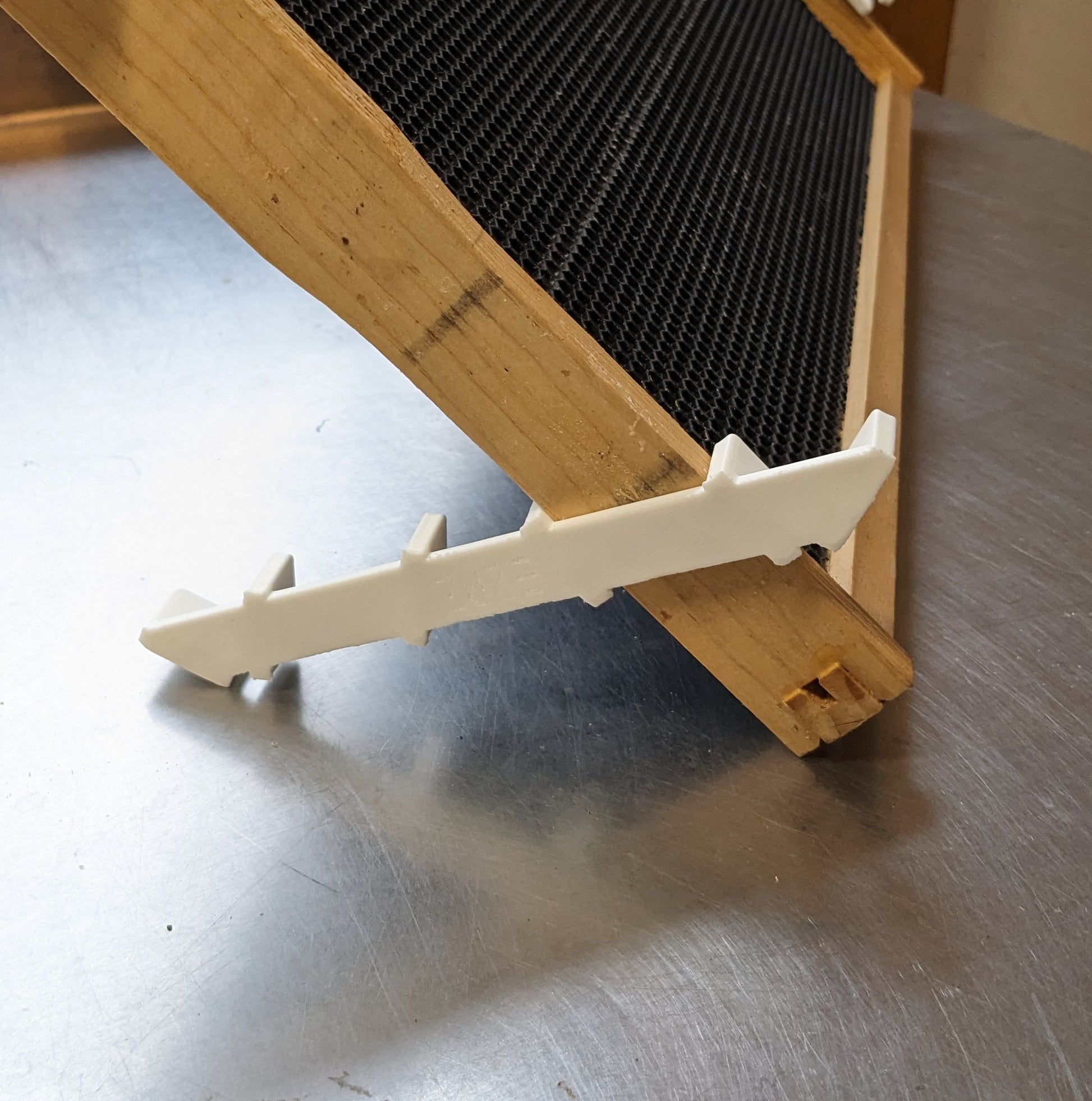 When grafting larvae for queen rearing, it's a good idea to prop up the frame in order to be able to see clearly into the bottom of the cells. There are plenty of options for this but I like a simple method. Lay a piece of newspaper on your table and set the frame in both bars at once. Practice first and find the angle you like. Cleanup and storage are easy with this simple tool. This pair of stands secures the frame at a shallow or steep angle depending on your preference. Made of PETG plastic.